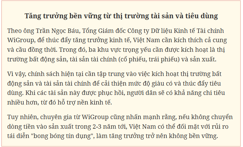 “Đà phục hồi này vẫn mang tính cục bộ và chưa lan tỏa rộng rãi trên toàn bộ nền kinh tế. Thực tế, một số doanh nghiệp và người dân vẫn gặp khó khăn trong việc tiếp cận vốn vay và ngay cả khi có thể vay được, khả năng tiêu thụ sản phẩm vẫn chưa thuận lợi” - ông Báu nhận định.