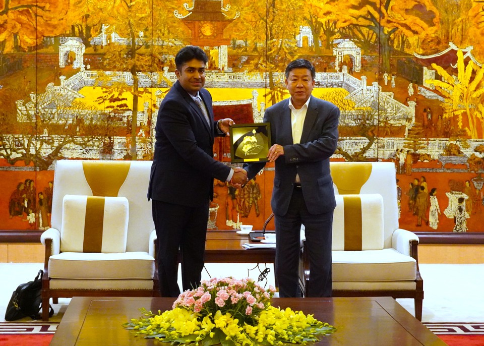 Phó Chủ tịch UBND TP Hà Nội Dương Đức Tuấn trao quà lưu niệm cho đại diện đoàn công tác của tập đoàn L&T. Ảnh: Việt Anh