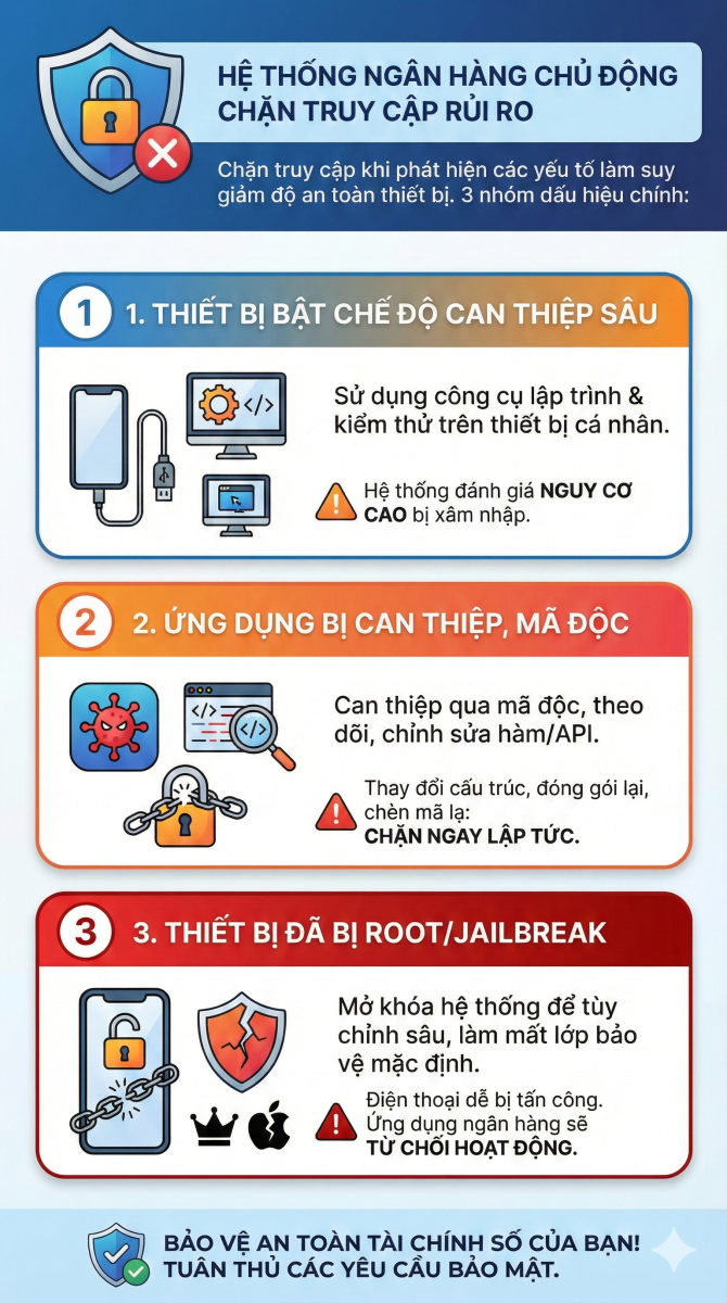 Các ngân hàng cho biết hệ thống sẽ chủ động nhận diện và chặn truy cập khi phát hiện những yếu tố làm suy giảm độ an toàn của thiết bị. Có ba nhóm dấu hiệu chính cần lưu ý.