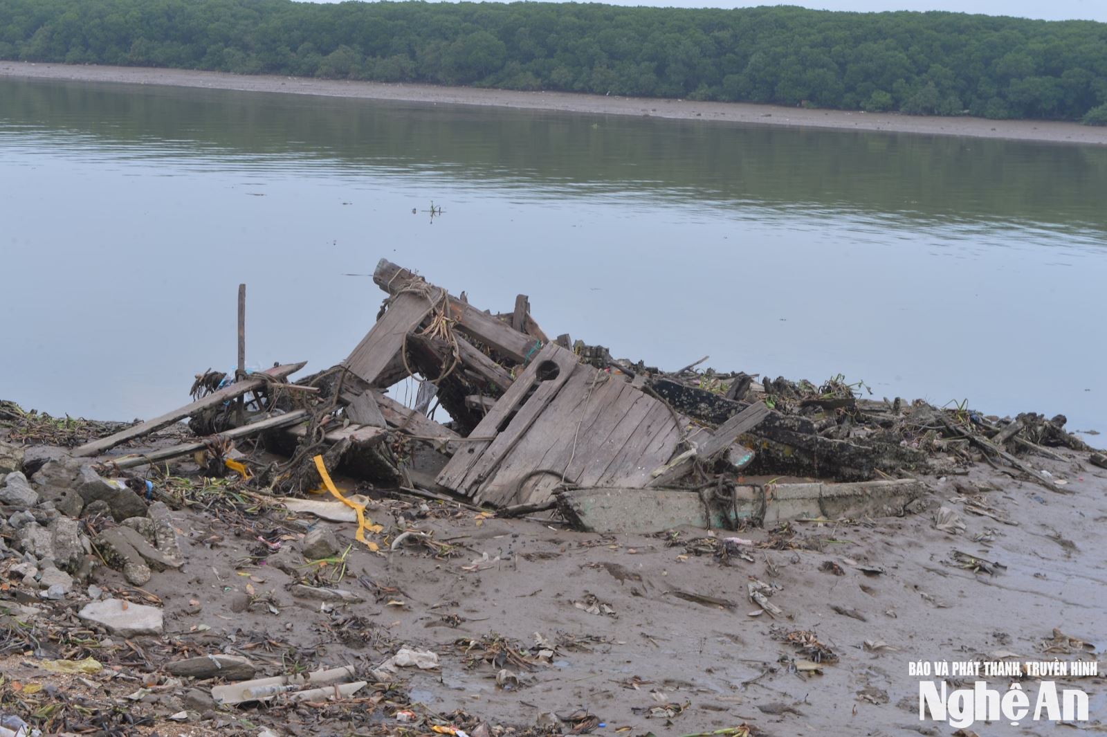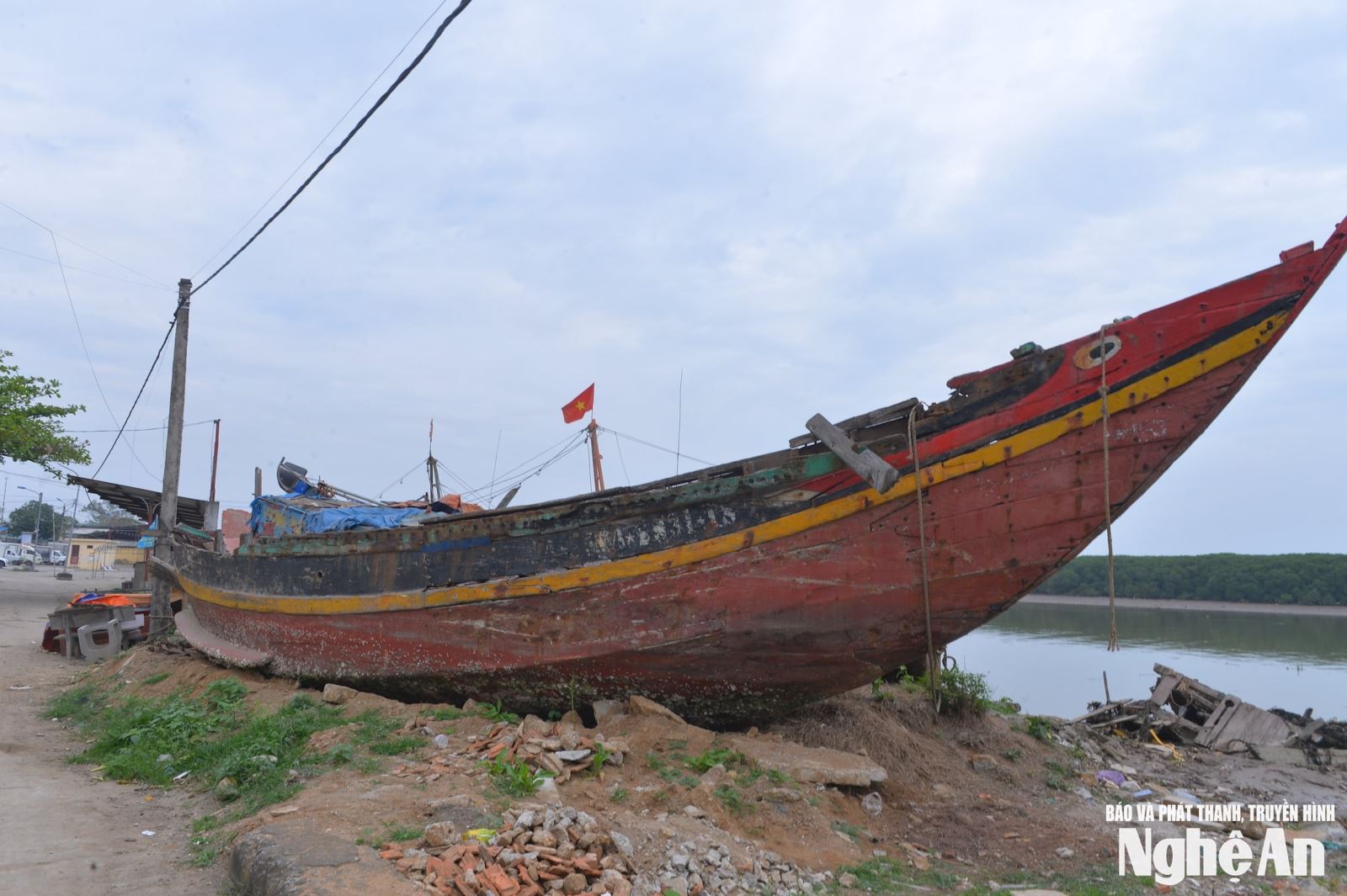 Một tàu cá bị hư hỏng do mắc cạn, nằm bỏ lại lâu ngày trên khu vực Lạch Vạn (Diễn Châu, Nghệ An). Ảnh: Văn Trường