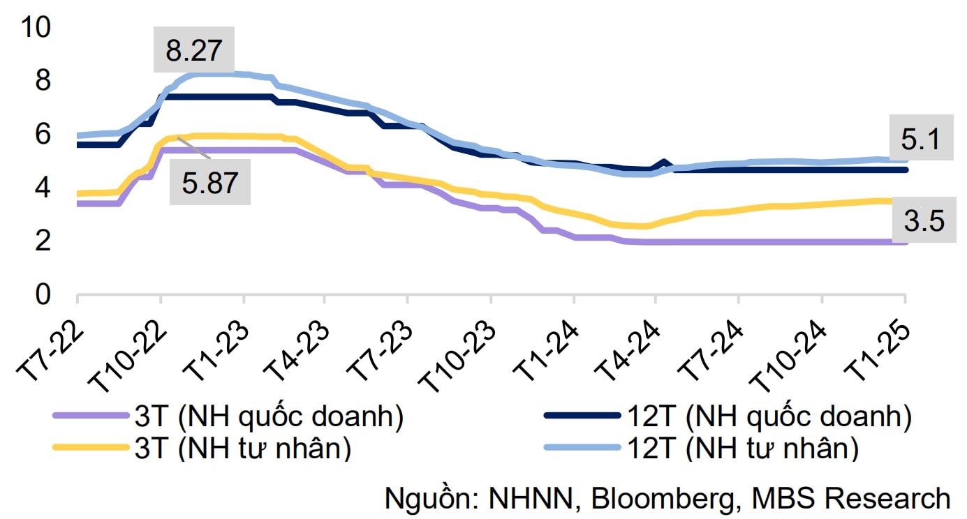 "Tuy vậy, NHNN đã đưa ra chỉ đạo về việc ổn định lãi suất huy động và tiếp tục phấn đấu giảm lãi suất cho vay. Dựa vào các yếu tố trên, chúng tôi dự báo lãi suất huy động kỳ hạn 12 tháng của các NHTM lớn sẽ dao động quanh mức 5% - 5,2% trong năm 2025", chuyên gia MBS dự báo.