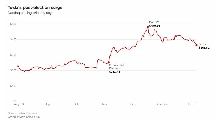 Cổ phiếu Tesla đã tăng 50% kể từ phiên 5/11/2024 sau cuộc bầu cử vì các nhà đầu tư đặt cược rằng hãng xe điện sẽ hưởng lợi khi Elon Musk tiếp cận sớm Tổng thống Donald Trump. Tuy nhiên, giá cổ phiếu đã giảm 4% trong phiên sau thông tin doanh số tệ hại tại Đức.