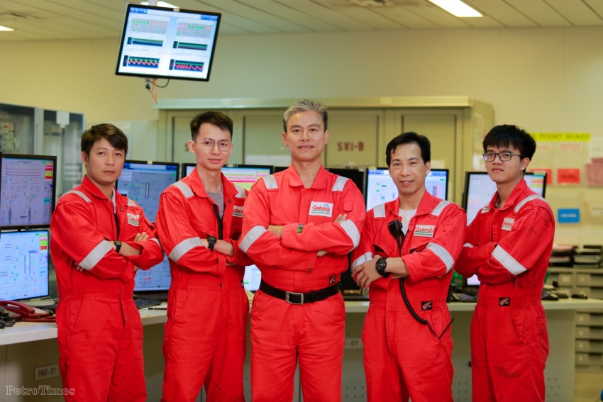 Giàn trưởng Phạm Vũ Thắng (giữa) và cán bộ kỹ sư trên giàn Sư Tử Vàng CPP.