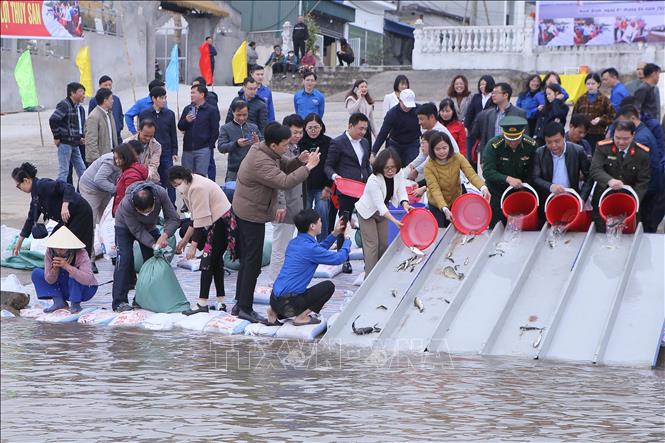 Thả con giống xuống sông Hồng nhằm tái tạo nguồn lợi thủy sản. Ảnh: Công Luật/TTXVN