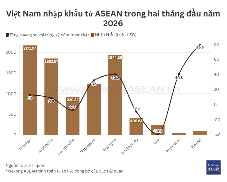 Theo số liệu từ Cục Hải quan, hai tháng đầu năm 2026, kim ngạch xuất nhập khẩu Việt Nam – ASEAN đạt 15,2 tỷ USD, tăng 12% so với cùng kỳ năm trước (YoY).