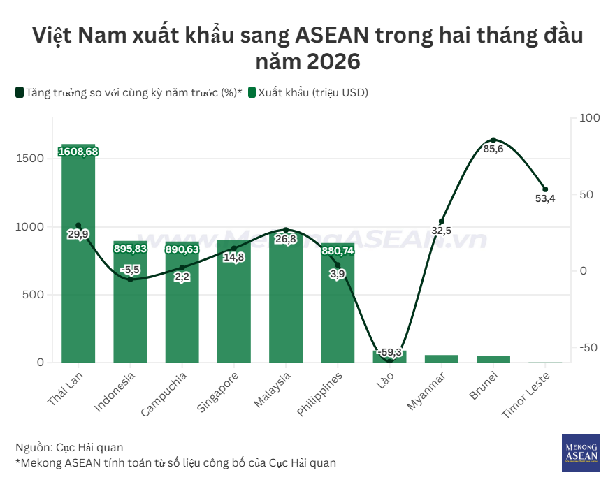 Lũy kế hai tháng đầu năm 2026, Việt Nam xuất khẩu sang ASEAN đạt 6,3 tỷ USD, trong đó Thái Lan là thị trường duy nhất đạt giá trị hơn một tỷ USD.