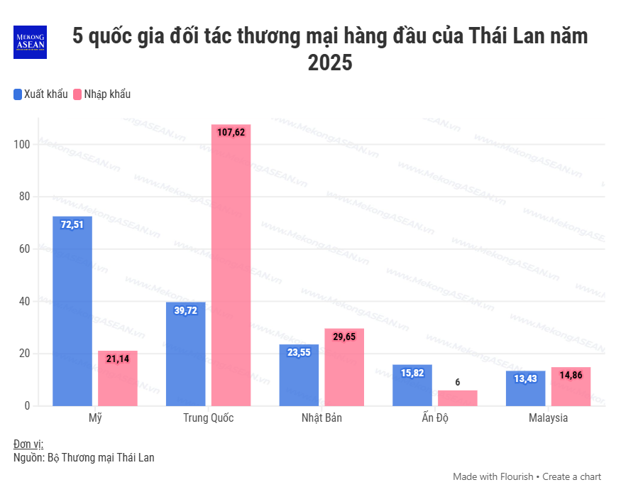Tính chung cả năm 2025, tổng giá trị xuất khẩu của Thái Lan đạt 339,64 tỷ USD, tăng 12,9% so với năm 2024 (YoY) - kỷ lục mới của thương mại Thái Lan, theo Bộ Thương mại nước này. Nhập khẩu đạt 344,95 tỷ USD, cũng tăng 12,9% (YoY). Cán cân thương mại ghi nhận mức nhập siêu khoảng 5,31 tỷ USD.
