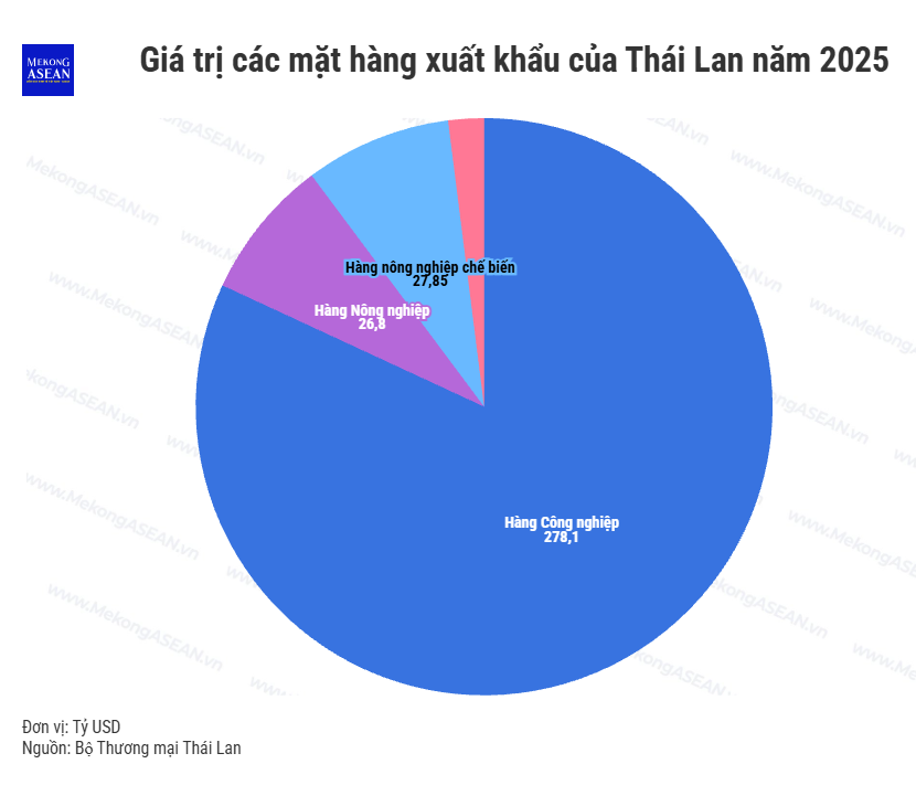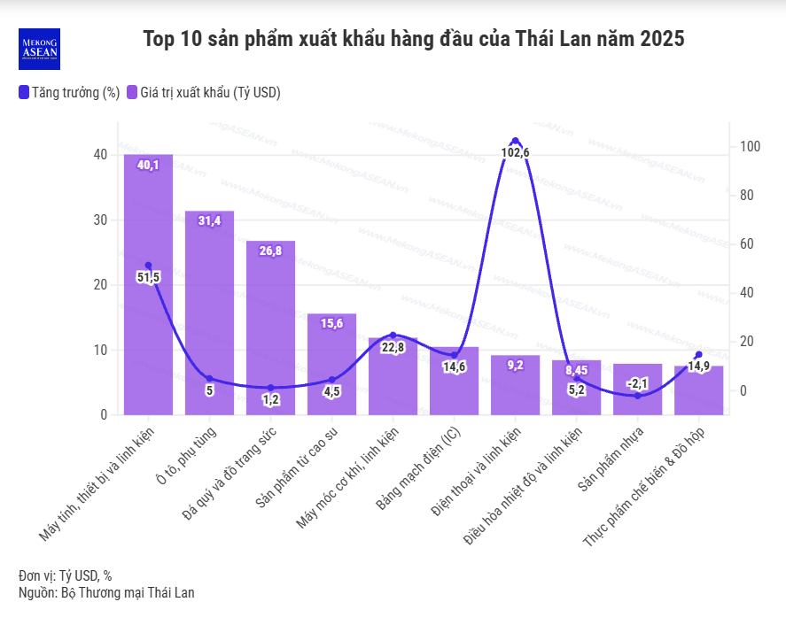 Tính chung cả năm 2025, xuất khẩu hàng công nghiệp của Thái Lan tăng khoảng 17,4%, trong đó, nhóm máy tính, thiết bị và linh kiện là mặt hàng xuất khẩu lớn nhất của Thái Lan, đạt khoảng 40,1 tỷ USD, tăng tới 51,5% YoY.
