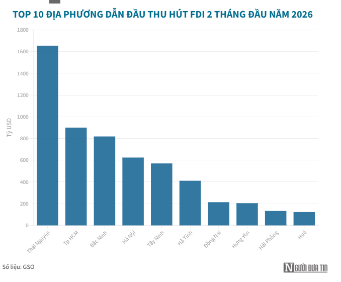 2 tháng đầu năm 2026, tổng vốn FDI của 10 địa phương dẫn đầu đạt 5,65 tỷ USD, trong đó Thái Nguyên dẫn đầu khi thu hút gần 1,7 tỷ USD.