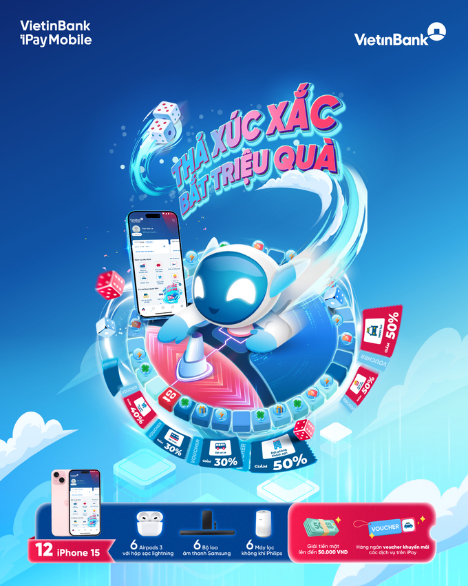 Cơ hội trúng iPhone 15, AirPods 3, bộ loa Samsung… miễn phí cùng hàng ngàn phần thưởng có giá trị trên VietinBank iPay Mobile.