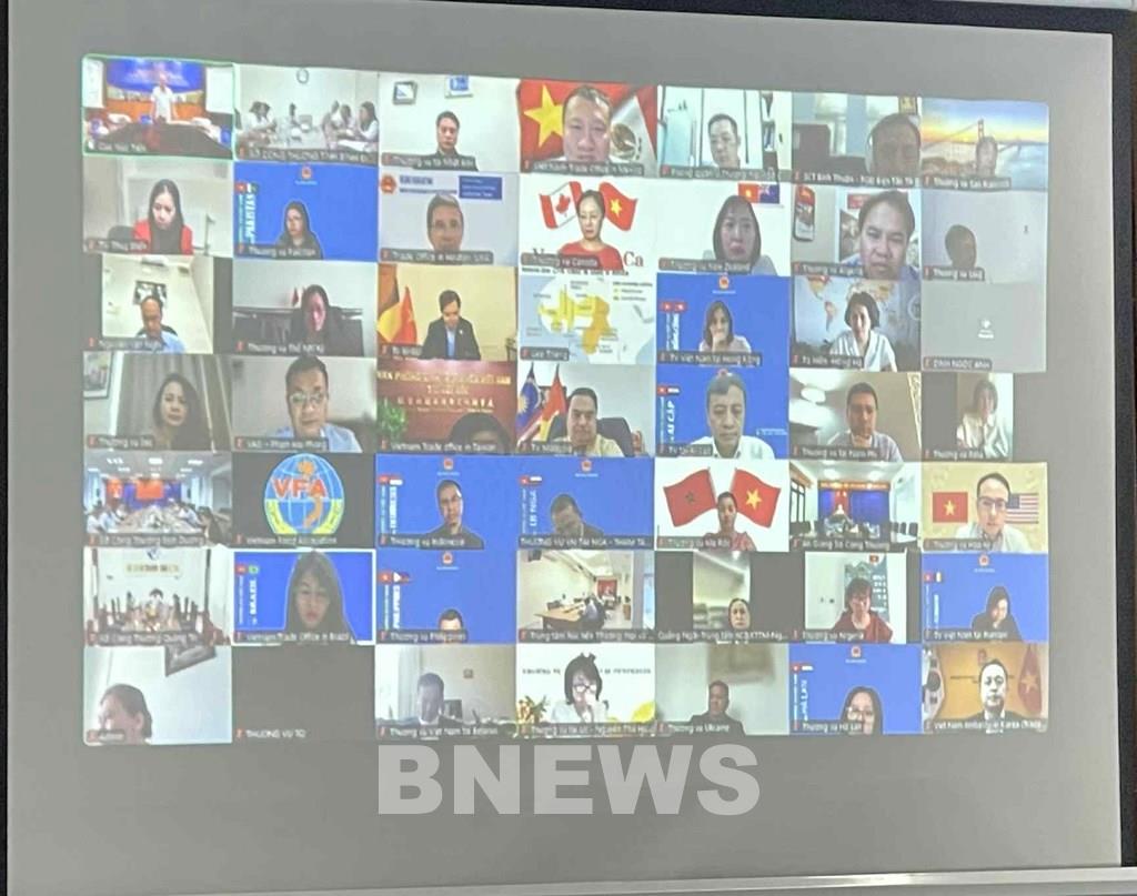 Đại diện các cơ quan thương vụ Việt Nam tại nước ngoài tham dự hội nghị theo hình thức trực tuyến. Ảnh: Uyên Hương/BNEWS/TTXVN