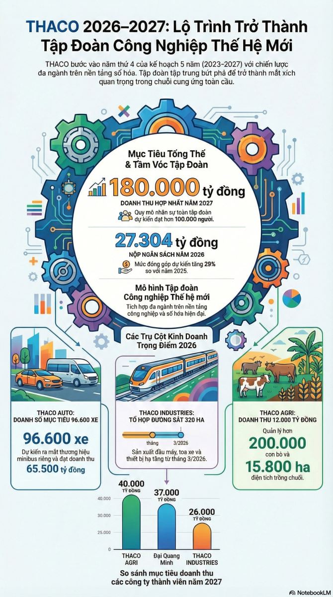 Dự kiến năm 2026, THACO nộp ngân sách 27.304 tỷ đồng, tăng 29% so với 2025; trong đó đóng góp tại TP. Đà Nẵng 21.043 tỷ đồng, còn lại tại TP.HCM và các địa phương khác 6.261 tỷ đồng.