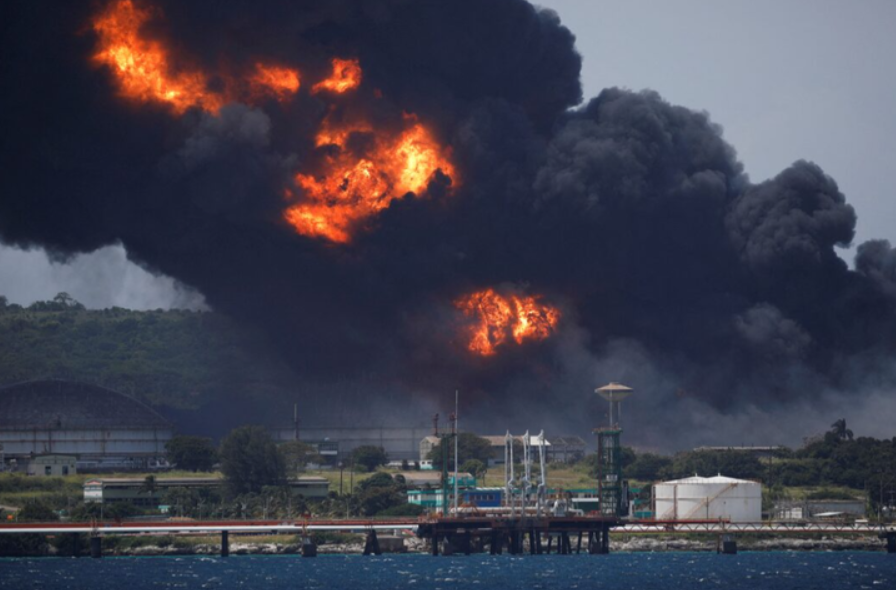 Khói đen cuồn cuộn bốc lên từ vụ cháy bồn chứa dầu gần cảng ở Matanzas, Cuba, ngày 6-8-2022 - Ảnh: REUTERS