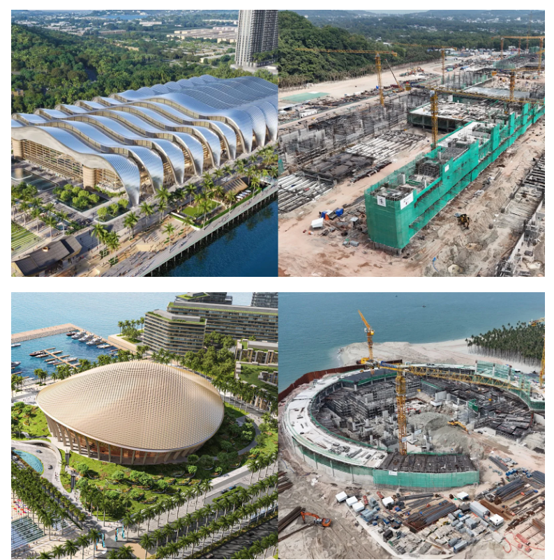 Phối cảnh các công trình Trung tâm hội nghị triển lãm, Nhà hát đa năng (trái) và các công trình đang thi công thực tế. Ảnh: Sun Group