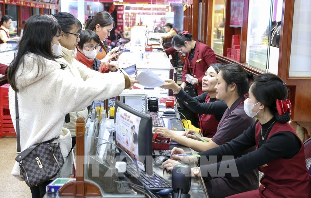 Khách mua vàng tại một cửa hàng trên phố Trần Nhân Tông, quận Hai Bà Trưng, thành phố Hà Nội. Ảnh: Lê Đông - TTXVN