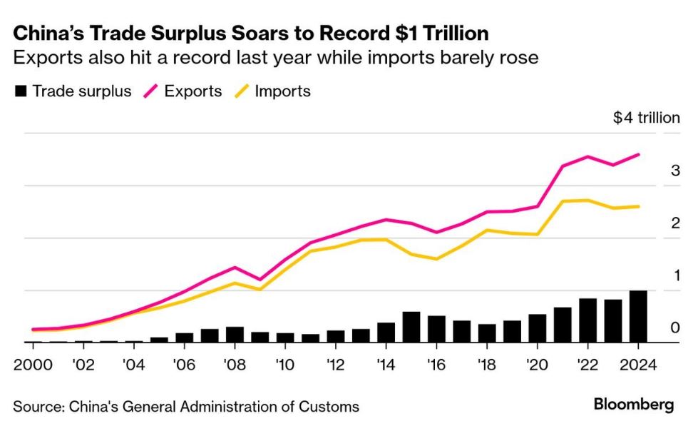 Thặng dư thương mại của Trung Quốc đã đạt kỷ lục mới với gần 1.000 tỉ đô la Mỹ trong năm 2024. Dòng chảy ồ ạt của hàng giá rẻ Trung Quốc gây lo ngại từ EU, Mỹ cho đến Brazil, Indonesia... những bên đang tìm cách bảo vệ nền sản xuất và việc làm trong nước.