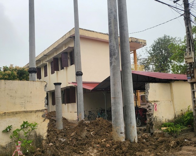 Trong khi các cơ quan chưa có bất cứ văn bản hay quyết định nào về việc xây dựng trạm biến áp nói trên gửi đến nhà trường, thì ngày 2/4, đơn vị thi công đã cho máy xúc đến phá một đoạn tường rào, múc móng, dựng cột…Đến hiện tại, đơn vị thi công đã thực hiện xong việc dựng cột.