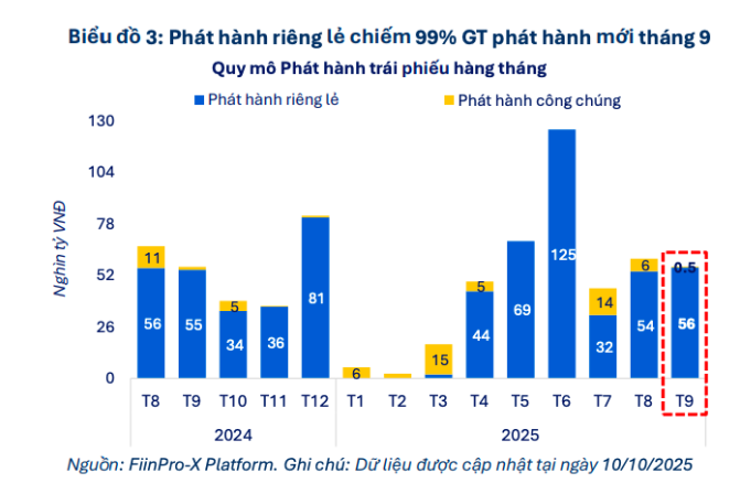Về mặt phát hành mới, tổng giá trị phát hành TPDN trong tháng 9/2025 đạt 56,4 nghìn tỷ đồng, giảm 6,6% so với tháng trước nhưng lại tăng nhẹ 0,3% so với cùng kỳ năm trước. Cấu trúc phát hành vẫn nghiêng về phát hành trái phiếu riêng lẻ, chiếm đến 99%, trong khi kênh công chúng chỉ đạt 499 tỷ đồng, giảm mạnh 92% so với tháng trước và 66% so với cùng kỳ năm trước.