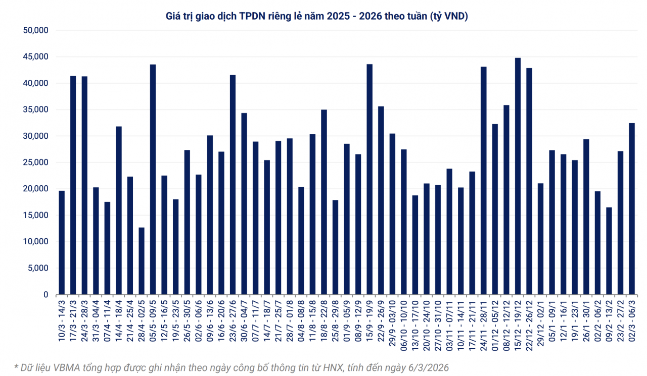 Trên thị trường thứ cấp, thanh khoản trái phiếu phát hành riêng lẻ trong tuần qua ghi nhận xu hướng cải thiện. Giá trị giao dịch bình quân ngày đạt khoảng 6.492 tỷ đồng, tăng 19,6% so với tuần trước. Tính chung từ đầu năm 2026 đến nay, tổng giá trị giao dịch trái phiếu phát hành riêng lẻ trên thị trường đạt khoảng 204 nghìn tỷ đồng.
