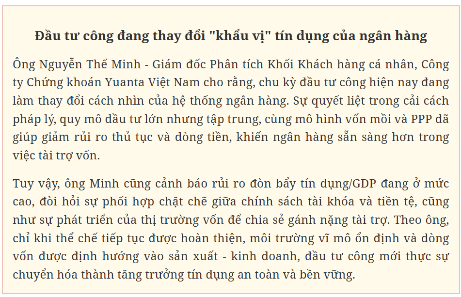 Theo ông Lệnh, dù nguồn vốn chủ đạo của đầu tư công đến từ ngân sách nhà nước, nhưng trong quá trình triển khai, các doanh nghiệp tham gia thiết kế, thi công, xây dựng đều có nhu cầu lớn về vốn lưu động, và tín dụng ngân hàng đóng vai trò then chốt. Khi các hạng mục được triển khai theo từng giai đoạn, dòng vốn ngân sách giải ngân trở thành nguồn trả nợ cho các khoản vay ngân hàng, tạo nên mối liên kết chặt chẽ giữa đầu tư công - tín dụng - tăng trưởng kinh tế.