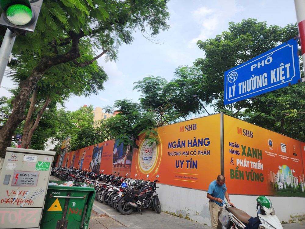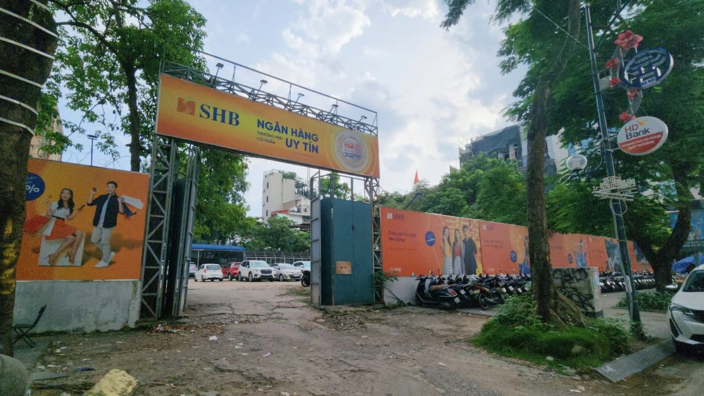 Tuy nhiên, ghi nhận thực tế cho thấy, dù đã bước sang nửa cuối năm 2025, dự án vẫn chưa có dấu hiệu được triển khai. Khu đất “kim cương” với 3 mặt tiền đắt giá tiếp giáp các phố Hàng Bài, Lý Thường Kiệt và Vọng Đức, hiện vẫn được quây kín bởi những tấm bạt in hình ảnh thương hiệu SHB, không bóng dáng công trình, không tiếng động của thi công. Bên trong, một số khung sắt mái vòm dựng tạm từ trước vẫn tồn tại. Toàn bộ không gian trong và ngoài khu đất vẫn đang được tận dụng làm bãi gửi xe ô tô và xe máy.