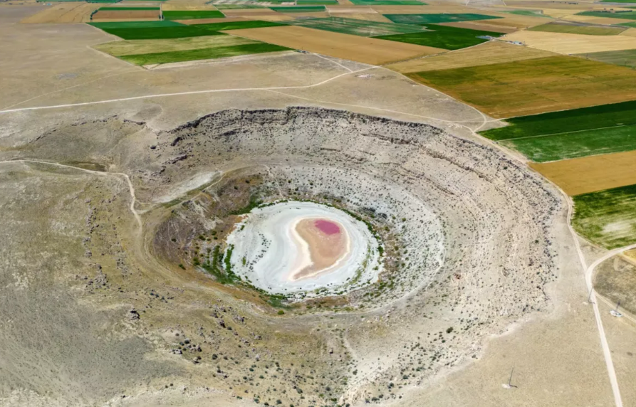 Hố sụt Meyil ở Karapinar, thuộc tỉnh Konya, miền Trung Anatolia, Thổ Nhĩ Kỳ, chụp ngày 24/6/2024. Số lượng hố sụt đã tăng lên trong những năm gần đây do hạn hán và việc sử dụng quá mức nước ngầm. (Ảnh: AFP)