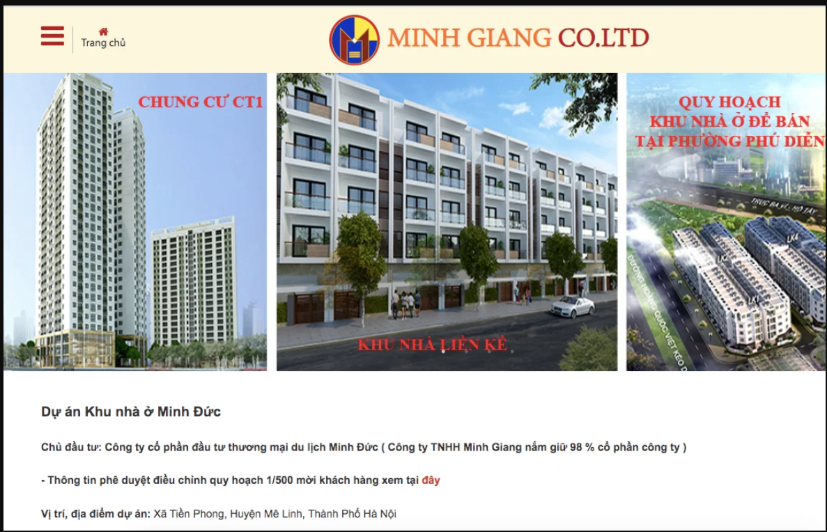 Trên website của Công ty TNHH Minh Giang cũng đề cập đến dự án khu nhà ở Minh Đức. Theo giới thiệu, chủ đầu tư là Công ty cổ phần đầu tư thương mại du lịch Minh Đức (Công ty TNHH Minh Giang nắm giữ 98 % cổ phần công ty).