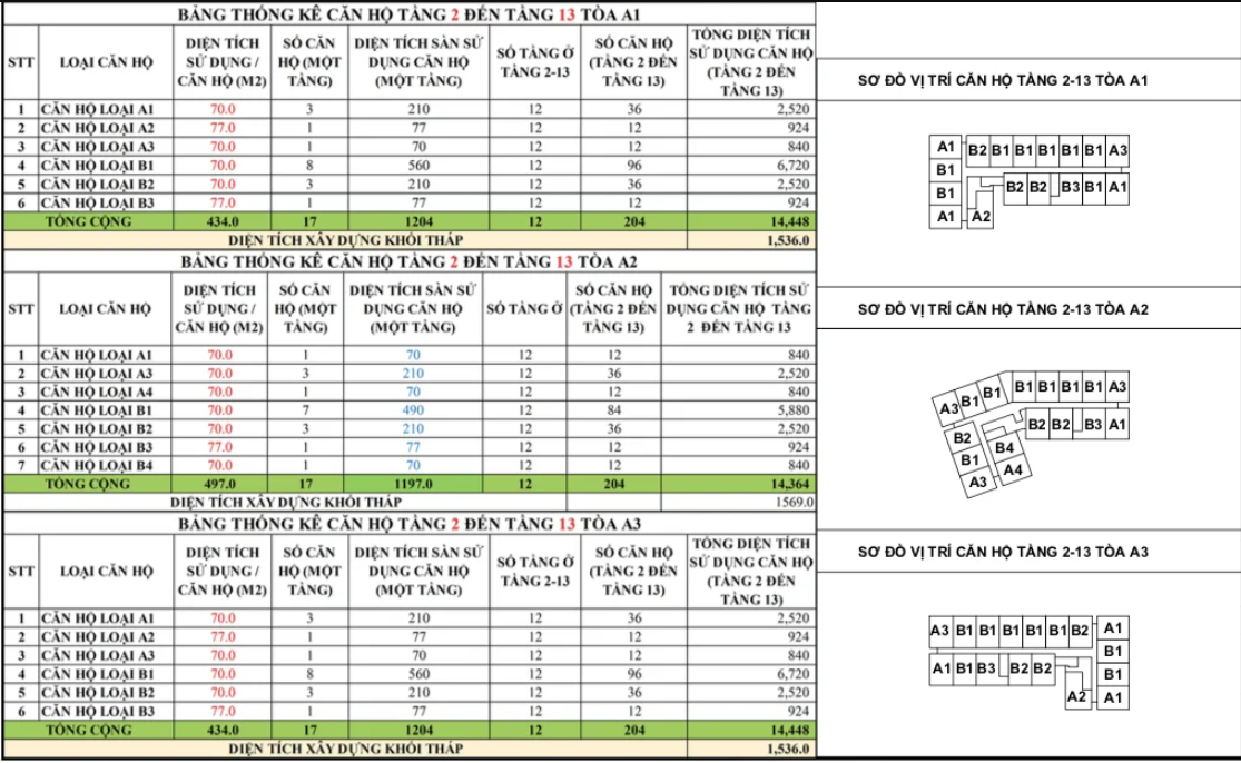 Dự án có các tòa A1, A2, A3, quy mô 13 tầng, tổng diện tích sàn xây dựng tầng căn hộ (từ tầng 2 đến tầng 13) khoảng 18.400m2 - 18.800m2. Diện tích các căn hộ từ 70m2 đến 77m2.