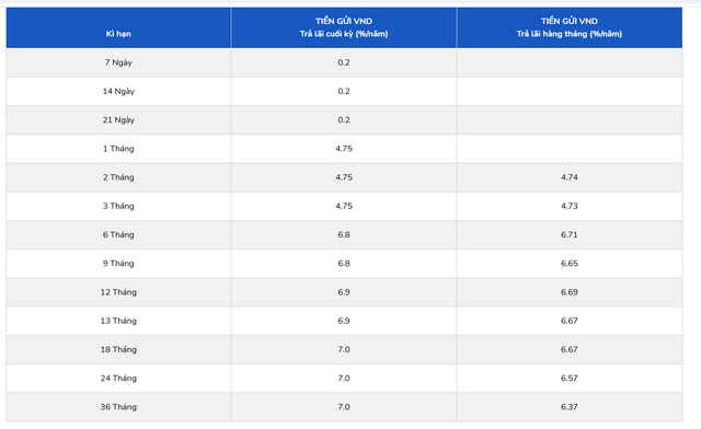 VPBank cũng áp dụng lãi suất từ 7%/năm trở lên tập trung chủ yếu ở kỳ hạn 6–7 tháng, áp dụng cho nhóm khách hàng Diamond và không yêu cầu số tiền gửi quá lớn.