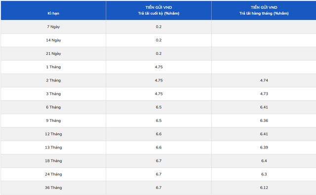 OCB là ngân hàng tiếp theo điều chỉnh tăng, áp dụng mức tăng 0,1–0,5 điểm % tùy kỳ hạn. Lãi suất kỳ hạn 1–4 tháng hiện ở mức 4,4–4,6%/năm; kỳ hạn 6–9 tháng 5,7%/năm; nhóm 12–15 tháng khoảng 5,8%/năm; và kỳ hạn 18–36 tháng ở mức 6,0–6,4%/năm, cao nhất là kỳ hạn 36 tháng.