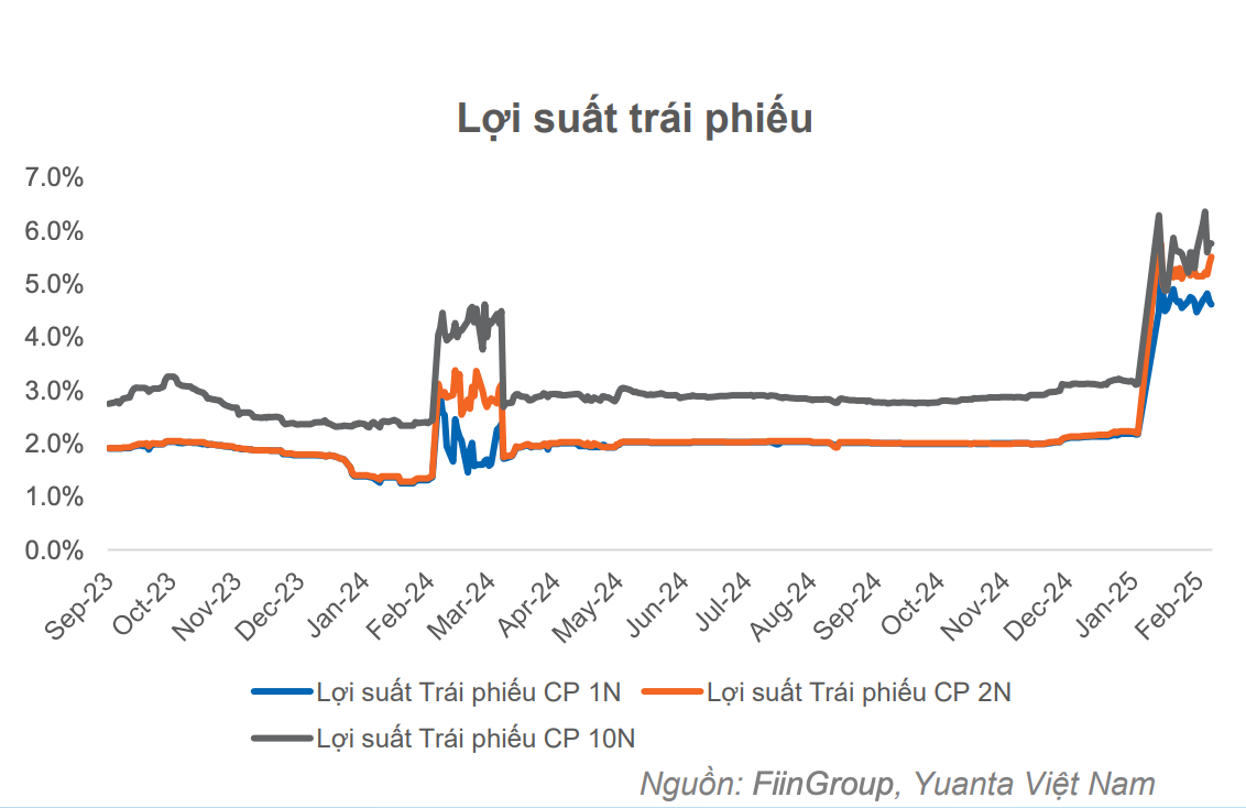 Có thể thấy, việc lợi suất trái phiếu chính phủ tăng mạnh trên tất cả các kỳ hạn trong tháng 2 là một trong những diễn biến đáng chú ý nhất. Lợi suất kỳ hạn 1 năm tăng 244 điểm cơ bản, kỳ hạn 2 năm tăng 331 điểm và kỳ hạn 10 năm tăng 264 điểm so với tháng trước.
