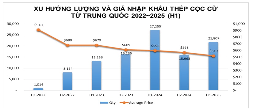 Sản lượng nhập khẩu cọc cừ đến từ quốc gia này tăng nhanh đáng kể từ nửa sau năm 2022 và đạt đỉnh vào nửa đầu năm 2024 với hơn 27 nghìn tấn ở mức giá giảm mạnh xuống còn $596/mt. Tuy sản lượng có giảm vào nửa năm sau đó nhưng vẫn duy trì ở mức cao. Trong 6 tháng đầu năm 2025, con số này lại tăng vọt lên hơn 21 nghìn tấn, với mức giá thấp bất thường chỉ $519/mt (nghĩa là tăng gấp 13 lần về lượng nhưng lại giảm ~43% về giá so với cùng kì năm 2022).