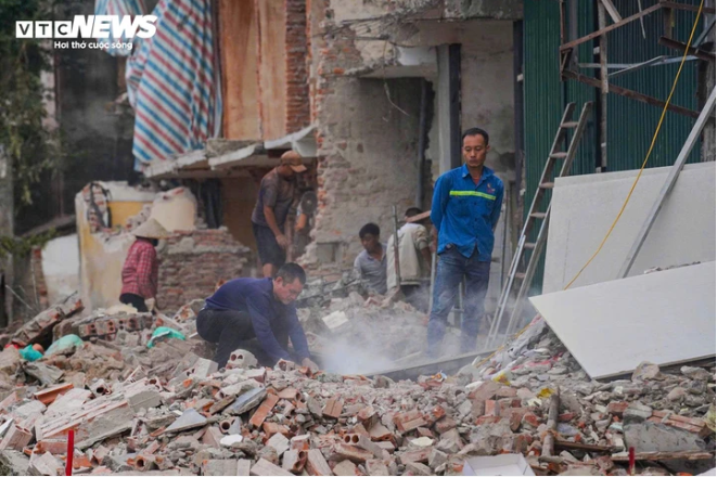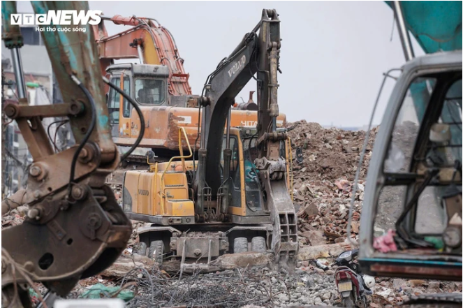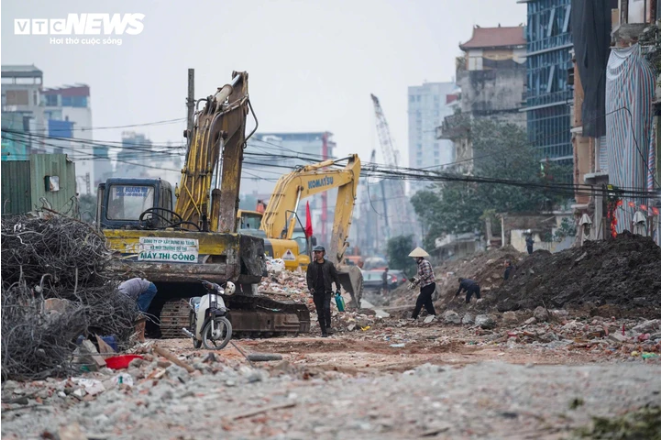 Ghi nhận thực tế, dọc tuyến phố Đê La Thành, mặt bằng sau phá dỡ đang được khẩn trương thu dọn. Máy xúc hoạt động liên tục để thu xà bần, gạch vỡ về một phía, giúp giải phóng không gian. Bên cạnh đó, các công nhân tất bật dọn dẹp thủ công, phối hợp cùng thiết bị cơ giới nhằm làm sạch mặt bằng, phục vụ các bước triển khai tiếp theo của dự án.