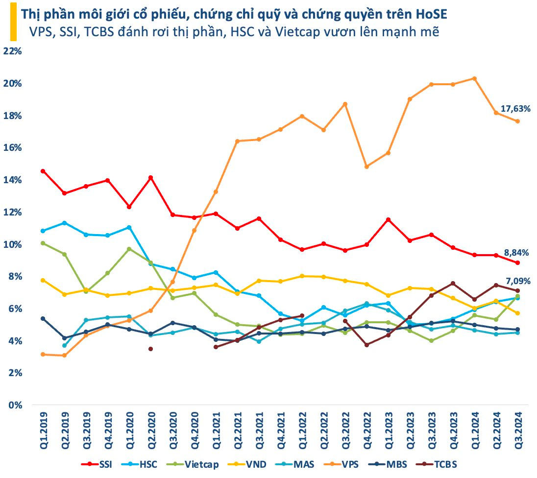 VPS vẫn dẫn đầu về thị phần môi giới trên HoSE trong quý 3 vừa qua nhưng thị phần đã bị thu hẹp đáng kể xuống mức 17,63% - thấp nhất trong vòng hơn một năm kể từ quý 2/2023.