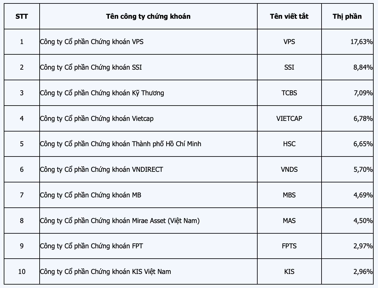 Sở Giao dịch Chứng khoán TP.HCM (HoSE) vừa công bố danh sách 10 công ty chứng khoán có thị phần giao dịch môi giới cổ phiếu, chứng chỉ quỹ và chứng quyền có đảm bảo lớn nhất trong quý 3/2024 bao gồm: VPS, SSI, TCBS, VNDIRECT, Vietcap, HSC MBS, Mirae Asset, FPTS và KIS với tổng thị phần 67,81%.