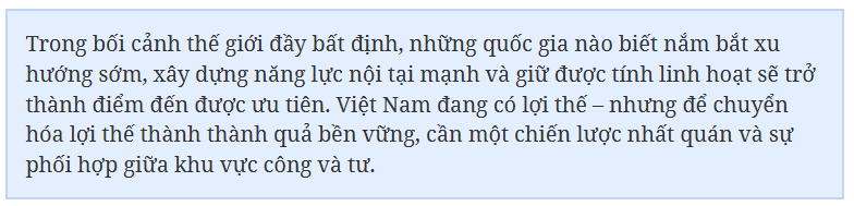 Không chỉ dừng lại ở quyết định thuê, nhiều doanh nghiệp đang trì hoãn kế hoạch đầu tư vốn. Trong bối cảnh đó, Việt Nam đang nổi lên như một điểm đến hấp dẫn. Với sự ổn định về chính trị, vị trí chiến lược tại trung tâm Đông Nam Á, chi phí lao động cạnh tranh, sự hội nhập sâu vào chuỗi cung ứng toàn cầu và cam kết cải thiện hạ tầng, Việt Nam đang đáp ứng phần lớn các tiêu chí của thế hệ khách thuê công nghiệp mới.