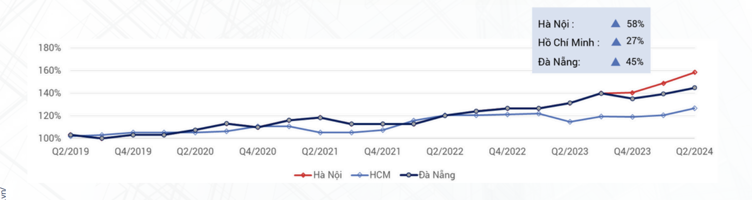 Tính đến Q2/2024, giá bán căn hộ sơ cấp trung bình tại Hà Nội gần tiệm cận mức 60 triệu VNĐ/m2. So với kỳ gốc (Q2/2019), giá bán căn hộ sơ cấp Hà Nội ghi nhận mức tăng vượt bậc với 58%, hơn gấp đôi so với tỷ lệ tăng (27%) của thị trường TP.HCM.