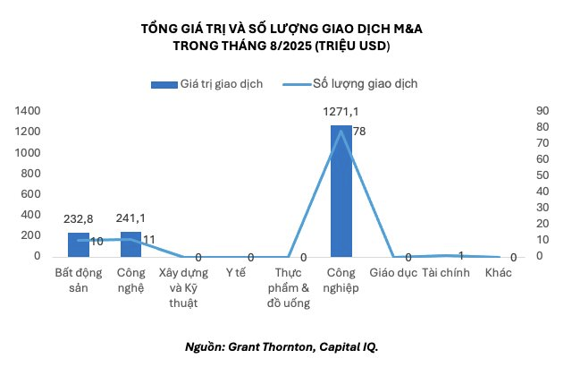 Thứ ba, công nghiệp dẫn dắt thị trường, bất động sản và công nghệ giữ vững vị thế: Vị thế chiến lược, điều kiện kinh tế vĩ mô thuận lợi cùng các cải cách pháp lý, đặc biệt là Luật Đất đai mới có hiệu lực từ tháng 8/2024, đã góp phần ổn định điều kiện tín dụng và tăng tính minh bạch cho thị trường. Tháng 8 ghi nhận 18 thương vụ M&A với tổng giá trị giao dịch 2,23 tỷ USD, trong đó lĩnh vực công nghiệp nổi bật với 78 giao dịch, chiếm 90% tổng số lượng giao dịch M&A trong tháng. Việt Nam đang trở thành điểm đến ưu tiên cho các nhà sản xuất và doanh nghiệp logistics toàn cầu nhờ vị trí chiến lược và chiến lược “Trung Quốc+1”. Chính phủ cũng nỗ lực cải thiện môi trường đầu tư thông qua các dự án hạ tầng trọng điểm và cải cách hành chính, giúp rút ngắn thời gian triển khai dự án. Dòng vốn ngoại mạnh mẽ chảy vào bất động sản công nghiệp đã trở thành xu hướng rõ rệt, thúc đẩy tăng trưởng giá thuê và kích thích hoạt động M&A trong phân khúc này.