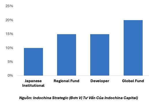 Thứ sáu, kỳ vọng lợi nhuận quay trở lại cao: Khảo sát cho thấy sự khác biệt rõ rệt về kỳ vọng lợi nhuận giữa các nhóm nhà đầu tư. Các quỹ toàn cầu thể hiện khẩu vị cao nhất với khoảng 20% mức chuẩn lợi nhuận, phản ánh sự tập trung vào các cơ hội tăng trưởng lớn và sẵn sàng chấp nhận rủi ro cao tại các thị trường mới nổi. Trong khi đó, các quỹ khu vực và nhà phát triển có mức kỳ vọng vừa phải, vào khoảng 15%, cân bằng giữa lợi suất hấp dẫn và yếu tố ổn định thị trường. Ngược lại, các nhà đầu tư tổ chức Nhật Bản thận trọng nhất, chỉ có 10% đặt kỳ vọng lợi nhuận cao, ưu tiên các tài sản ít rủi ro và thu nhập ổn định. Dữ liệu này cho thấy dòng vốn toàn cầu tiếp tục tìm kiếm tiềm năng tăng trưởng tại các thị trường như Việt Nam, trong khi các nhà đầu tư khu vực và Nhật Bản duy trì chiến lược thận trọng hoặc phòng thủ hơn.