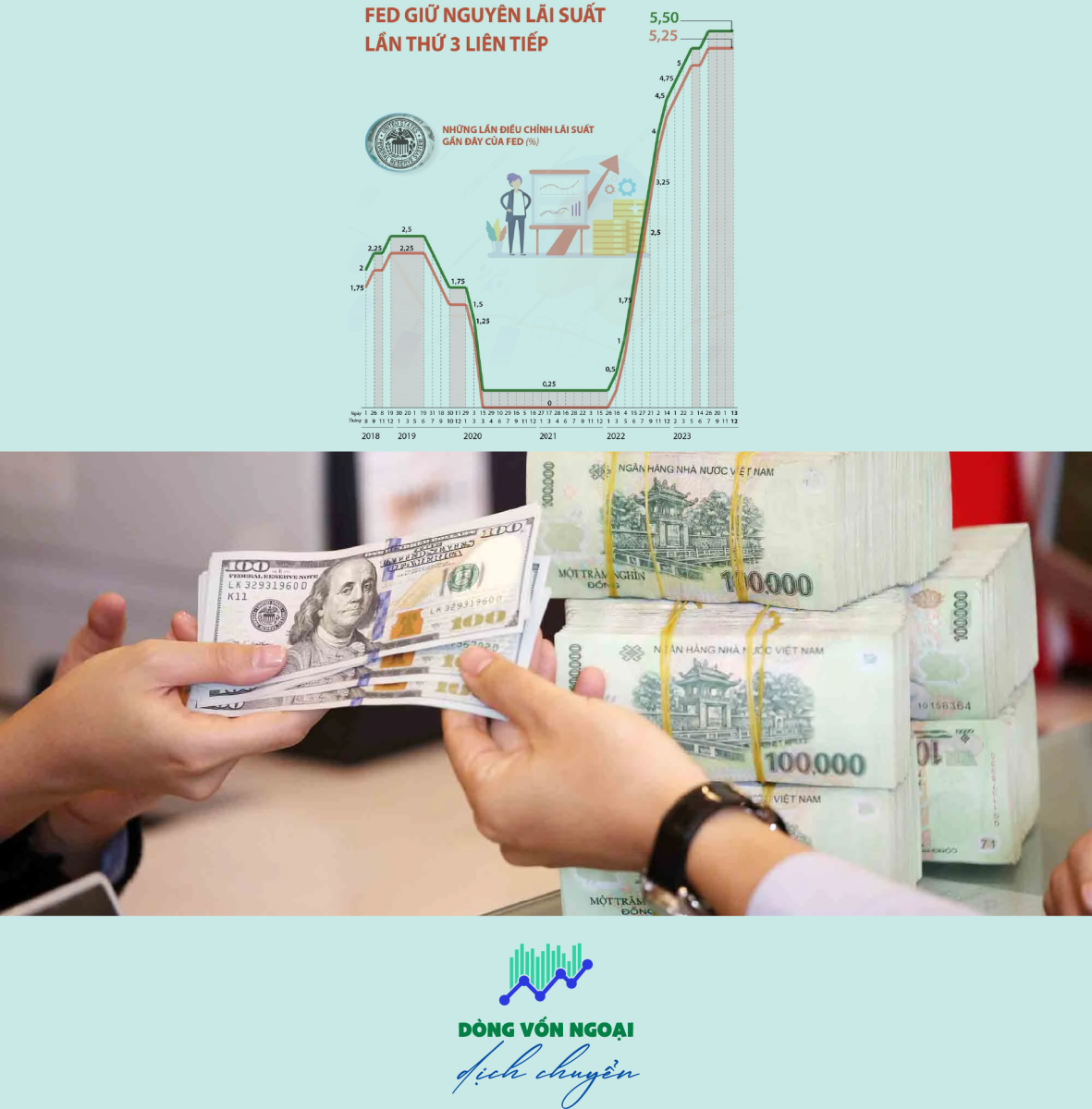 Điều khiến thị trường lo ngại là việc duy trì chính sách ngược với các ngân hàng trung ương khác, nhất là Cục Dự trữ Liên bang Mỹ (Fed) có thể khiến áp lực tỷ giá lên rất cao. Cho tới tận tháng 10/2023 vẫn chưa có tín hiệu nào rõ ràng về khả năng Fed dừng tăng lãi suất, thậm chí dự báo trong kỳ họp tháng 11 và 12 vẫn còn 2 lần tăng nữa. Rất may lo ngại này được giải tỏa, tỷ giá trong nước đạt đỉnh vào cuối tháng 10 và thị trường chứng khoán cũng kết thúc điều chỉnh cùng thời điểm.