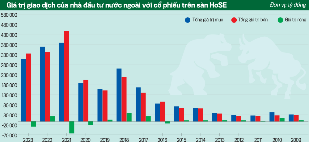 Một hệ quả ngược khác của câu chuyện tỷ giá và lãi suất là sự dịch chuyển của dòng vốn đầu tư gián tiếp rất rõ nét trên thị trường chứng khoán Việt Nam. Năm 2023 ghi nhận mức bán ròng với quy mô hơn 1 tỷ USD (khoảng 24.800 tỷ đồng) của nhà đầu tư nước ngoài, là mức cao thứ hai trong lịch sử thị trường chỉ sau năm 2021 với hơn 58.000 tỷ đồng.