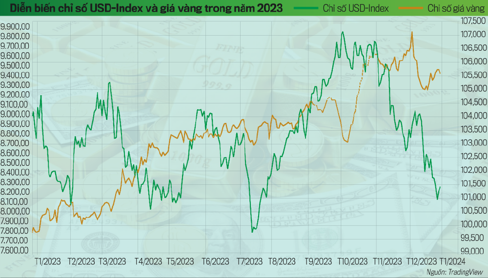 Khi câu chuyện về thị trường trái phiếu doanh nghiệp “nhạt” đi, mối quan tâm mới nổi bật trên thị trường chứng khoán từ cuối quý 3/2023 là vấn đề tỷ giá. Từ khoảng cuối tháng 8/2023, giá USD tại thị trường trong nước tăng vọt qua mốc 24.000 đồng và không có dấu hiệu dừng lại. Đến ngày 21/9/2023 Ngân hàng Nhà nước đột ngột thông báo phát hành tín phiếu hút tiền Đồng Việt Nam về. Động thái này lập tức gây tác động mạnh lên tâm lý trên thị trường chứng khoán, đúng vào thời điểm nhịp tăng đạt đỉnh cao 12 tháng. Thị trường chứng khoán rơi vào nhịp điều chỉnh mạnh trong vòng 2 tháng, VN-Index sụt giảm tới gần 19%.