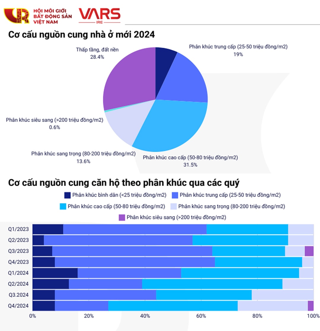 Số liệu về nguồn cung nhà ở mới và nguồn cung căn hộ theo phân khúc qua từng quý năm 2024 (Nguồn: VARS).