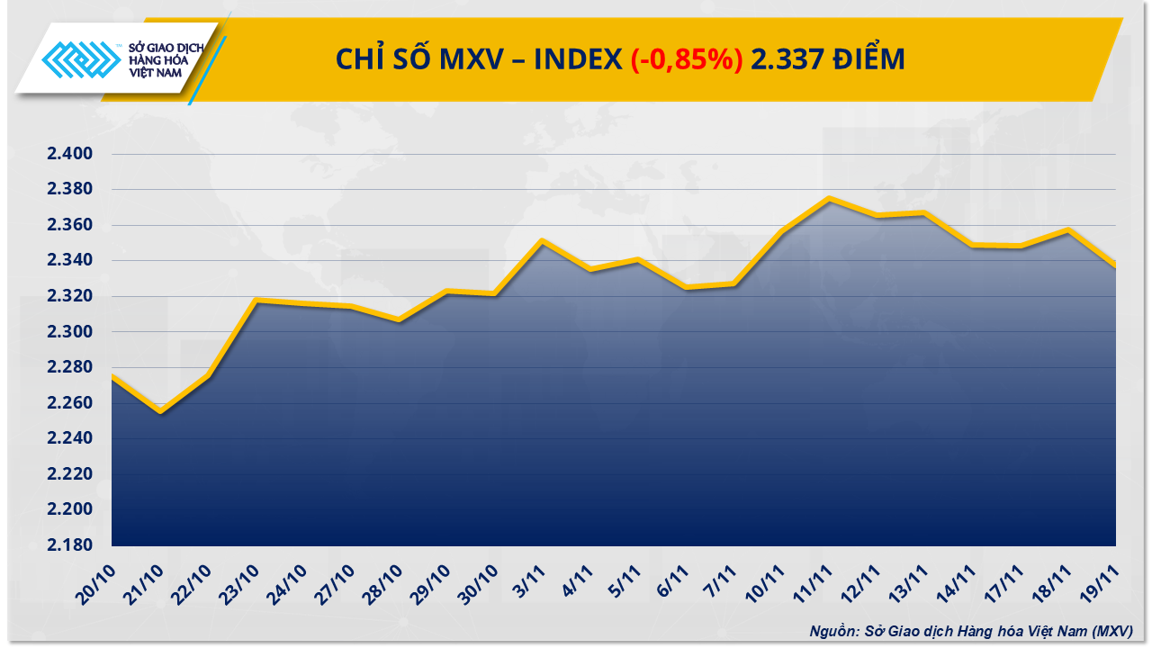 Thị trường hàng hóa thế giới đảo chiều trong phiên giao dịch hôm qua (19/11), khi sắc đỏ lan rộng 3 trên 4 nhóm hàng. Ca-cao gây chú ý khi giá lao dốc tới 6% trong bối cảnh kỳ vọng châu Âu trì hoãn Quy định chống phá rừng làm dịu bớt rủi ro nguồn cung. Bên cạnh đó, dầu thô chịu sức ép mới trước tín hiệu cho thấy nỗ lực thúc đẩy tiến trình chấm dứt xung đột Nga-Ukraine. Kết phiên, chỉ số MXV-Index lùi về 2.337 điểm, tương đương giảm hơn 0,85%.