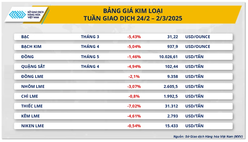 Sắc đỏ cũng bao vây thị trường kim loại trong tuần giao dịch vừa qua. Trong bối cảnh lo ngại về việc Cục Dự trữ Liên bang Mỹ (FED) sẽ tiếp tục duy trì lãi suất ở mức cao trong cuộc họp tháng 3, giá hai mặt hàng kim loại quý chịu sức ép mạnh.Chốt phiên giao dịch tuần, giá bạc lao dốc 5,43% xuống còn 31,22 USD/ounce. Trong khi giá bạch kim cũng đánh mất 5,04%, lùi về mức 937,9 USD/ounce, ghi nhận mức thấp nhất kể từ giữa tháng 1.