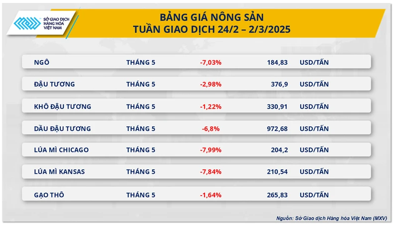 Thị trường nông sản tuần qua chứng kiến đà giảm sâu ở cả hai mặt hàng ngô và lúa mì, khi nguồn cung gia tăng và nhu cầu xuất khẩu đối mặt với nhiều thách thức.Kết thúc tuần giao dịch, giá ngô hợp đồng kỳ hạn tháng 5 giảm hơn 7% về mức 184 USD/tấn, kéo dài chuỗi 6 phiên lao dốc liên tiếp và đóng cửa ở mức thấp nhất trong gần hai tháng. Áp lực bán gia tăng khi giá chạm ngưỡng kháng cự tâm lý, trong bối cảnh thị trường phản ứng tiêu cực với báo cáo diện tích gieo trồng năm 2025 của Bộ Nông nghiệp Mỹ (USDA).