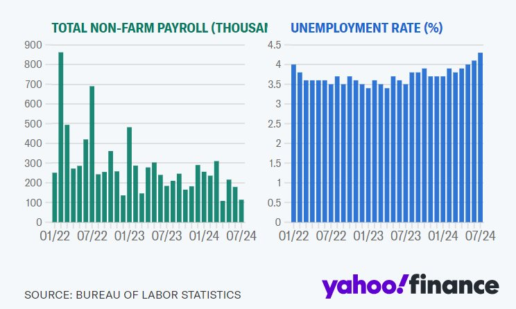 Vào tháng 7, nền kinh tế Mỹ tạo thêm 114.000 việc làm mới, thấp hơn nhiều so với ước tính. Trong khi đó, tỷ lệ thất nghiệp lại tăng lên mức cao nhất trong gần ba năm là 4,3%. Báo cáo này đã làm dấy lên nỗi lo về suy thoái kinh tế, khiến thị trường chứng khoán toàn cầu chìm trong sắc đỏ.