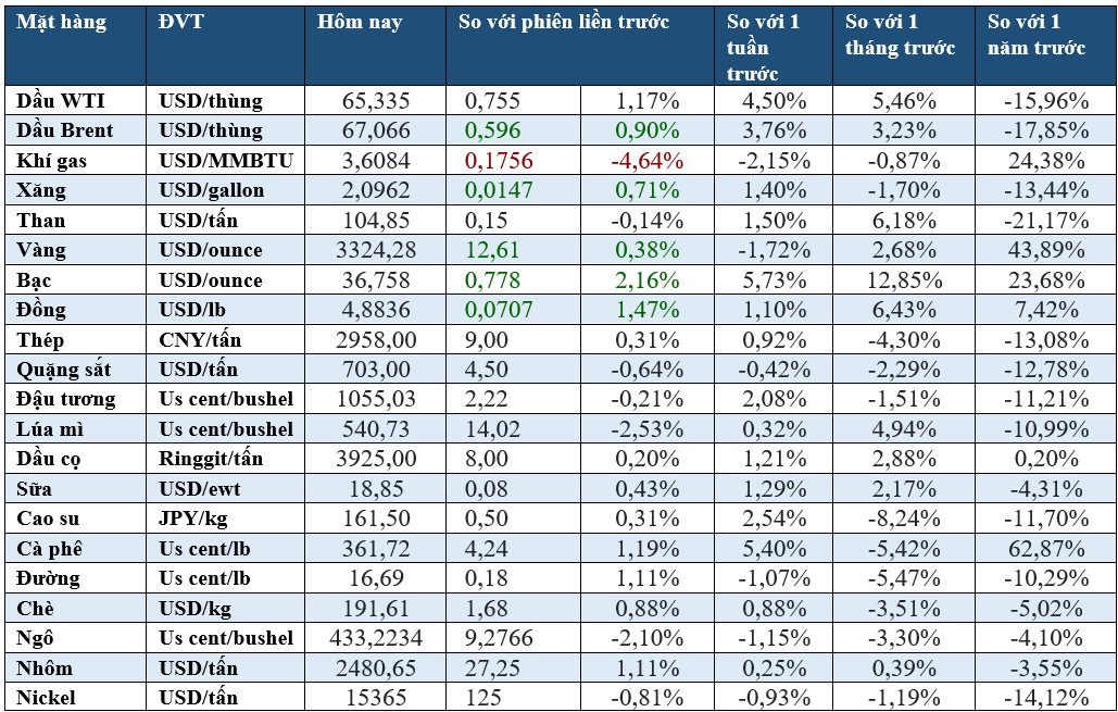 Chốt phiên giao dịch ngày 09/06/2025, kỳ vọng vào đàm phán thương mại Mỹ - Trung đã đẩy giá dầu đạt mức cao nhất trong nhiều tuần, giá vàng và đồng tăng.