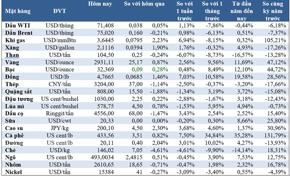 Cà phê Arabica tăng 1,2% lên 4,251 USD/lb. Giá Arabica đã tăng lên mức cao nhất mọi thời đại là 4,2995 USD/lb vào thứ Ba, là phiên 14 liên tiếp lập kỷ lục cao, trước khi giảm mạnh.