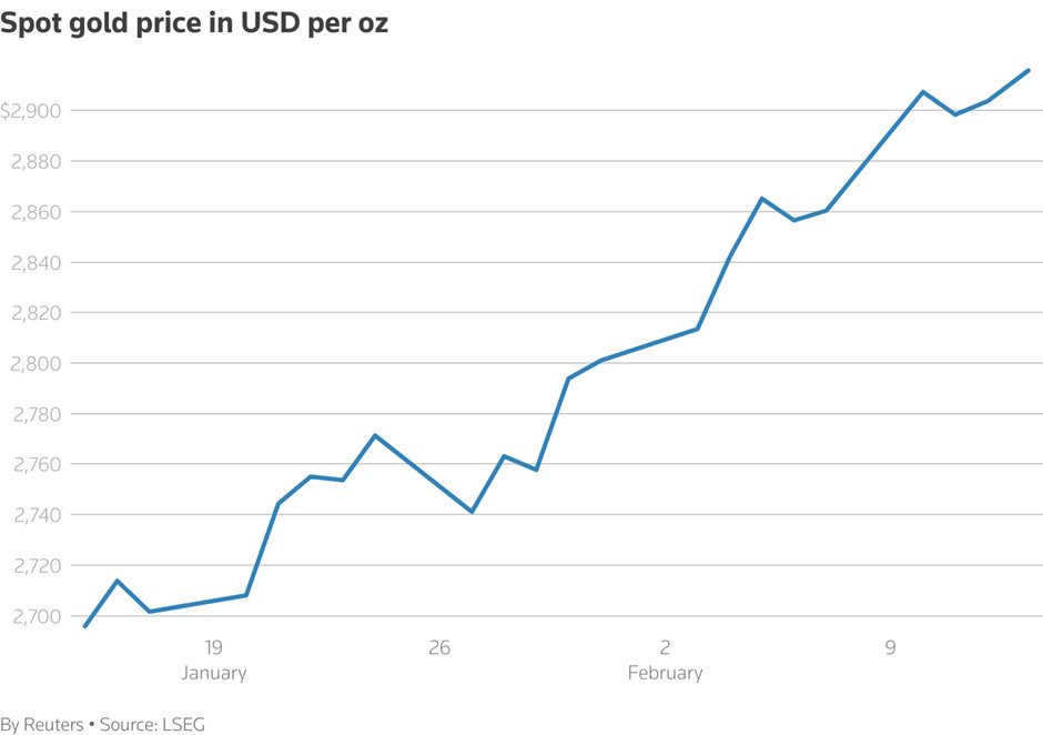 Vàng giao ngay quay trở lại mức cao kỷ lục, là 2.942,70 USD đã đạt được vào thứ Ba, kết thúc phiên tăng 0,4% lên 2.915,76 USD/ounce. Vàng kỳ hạn tháng 4/2025 tăng 0,6% lên 2.945,40 USD.
